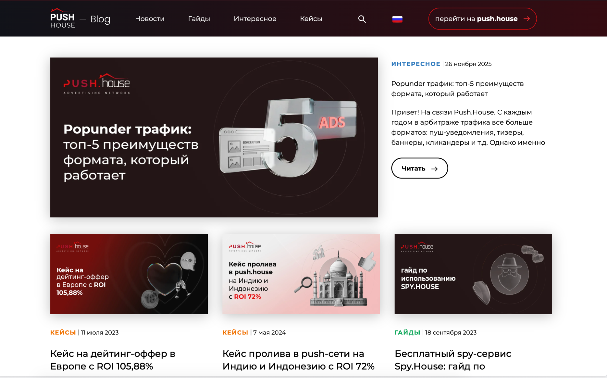 За годы работы платформа эволюционировала из классической пуш-сети в полноценную экосистему для арбитражников и рекламодателей, работающих с офферами всех ключевых вертикалей рынка. Сегодня Push.house обеспечивает стабильные обьемы трафика, сочетая технологии, масштаб и удобство работы в одном интерфейсе.