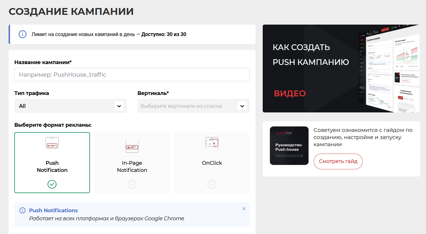 Push.House предлагает две модели закупки трафика, ориентированные на разные задачи и уровень подготовки рекламодателя. Это позволяет гибко выстраивать стратегию работы — от быстрых тестов до глубокой оптимизации и масштабирования.
