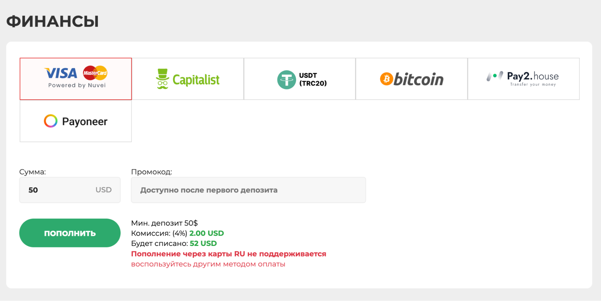- Популярные способы пополнения: Bank Cards, Capitalist, USDT TRC20, Payoneer, Bitcoin, Pay2.house;