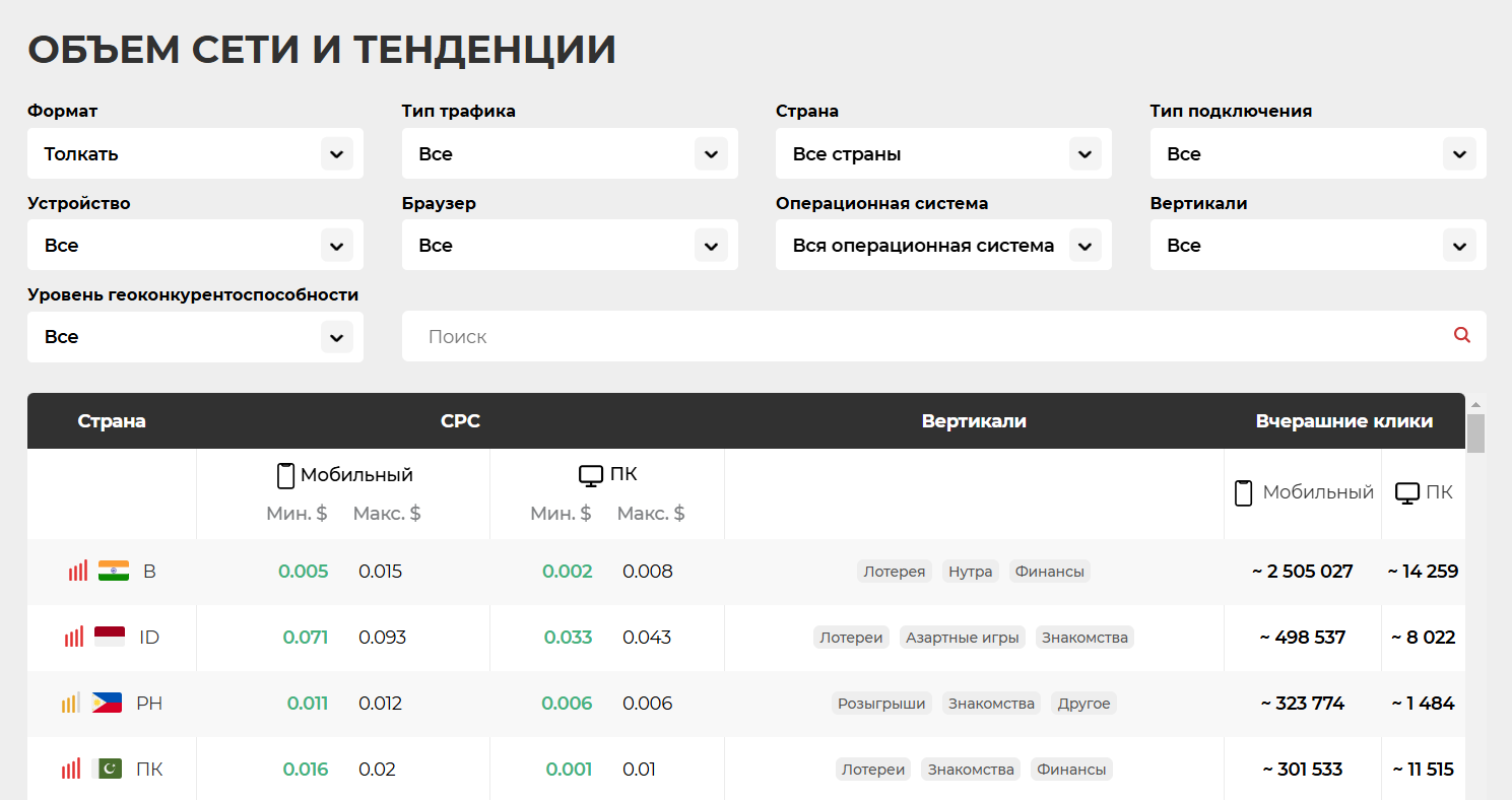 Трафика предлагают много: охватывают десятки стран, есть таргетинг гео, устройство, ОС, браузер и т. д.